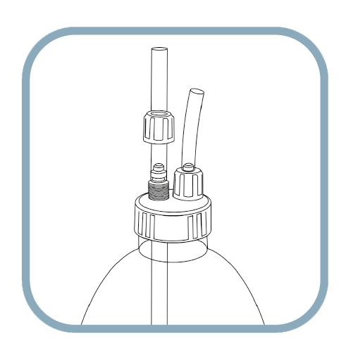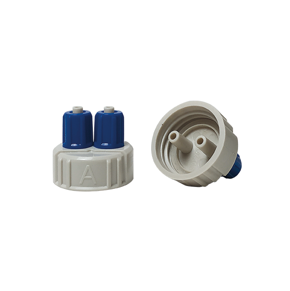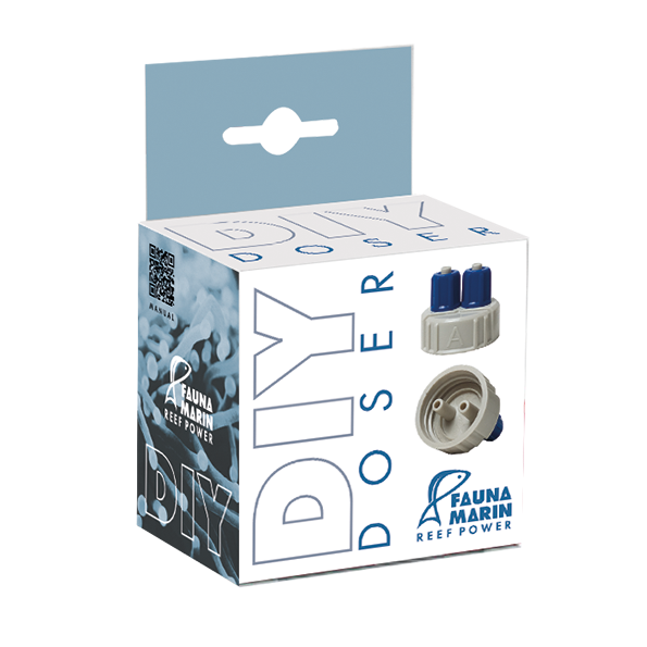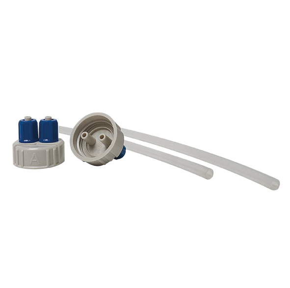 Dosing adapter cover for direct connection of dosing pump tubes to dosing containers (e.g. Fauna Marin ELEMENTALS). For this purpose, the original cap of the bottles is simply replaced by the new DIY-Doser. The hose takes up the liquid product directly from the bottom of the container, so that the container will be emptied completely. Additional bottles can be connected via the second port if required.